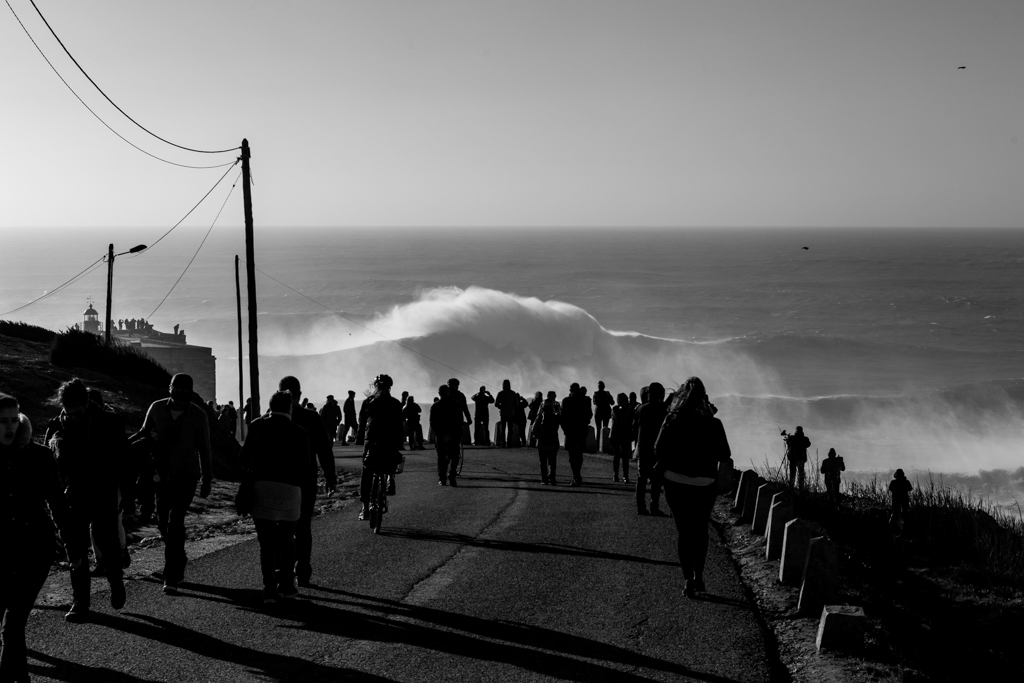 Janvier 2018, un énorme swell s’abat sur l’Europe. Comme un pèlerinage, les badauds s’amassent pour admirer les murs d’eau de dix étages. La pointe de Praia del Norte est située face à un canyon sous-marin, au large, qui ne dégrade pas la houle et lui confère une hauteur et une puissance inconcevable. Ces jours là, sous un soleil de feu et un vent offshore soutenu, les meilleurs big wave riders du globe surferont les plus impressionnantes vagues de tous les temps.